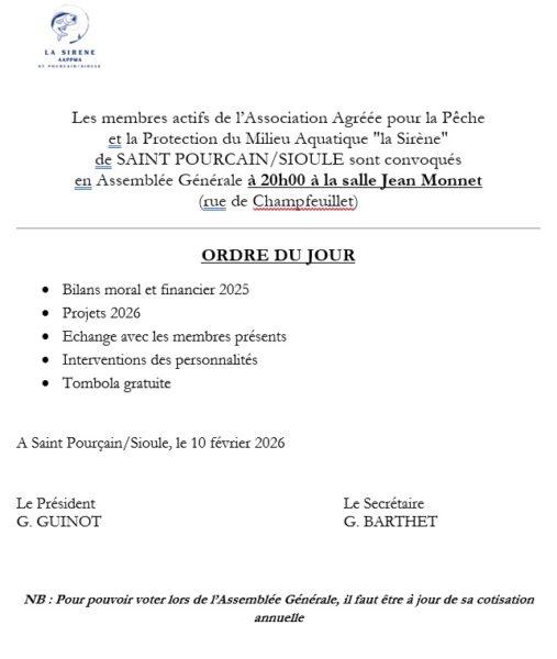 AAPPMA ST POURCAIN/SIOULE – Assemblée Générale le vendredi 27 février 2026