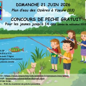 Un concours rien que pour les jeunes pêcheurs ! Tu aimes taquiner le poisson et passer du bon temps au bord de l’eau en famille ? Alors viens tenter ta chance lors de notre concours de pêche spécial jeunes ! Quand ? le dimanche 21 juin Où ? Plan d’eau des Ozières à Yzeure (03) Pour...