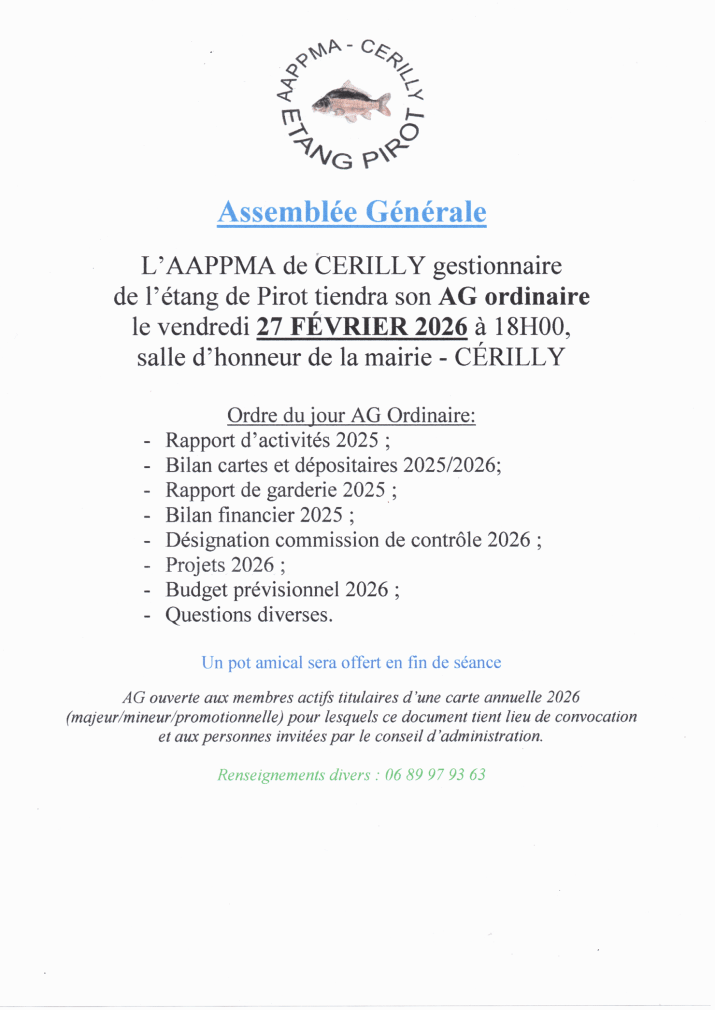 AAPPMA Cérilly/étang de Pirot – le vendredi 27 février 2026 Date Fév 27 2026 Heure 18 h 00 min Lieu Salle d'honneur de la Mairie de CERILLY Catégorie Cerilly Organisateur AAPPMA CERILLY Partagez cet événement