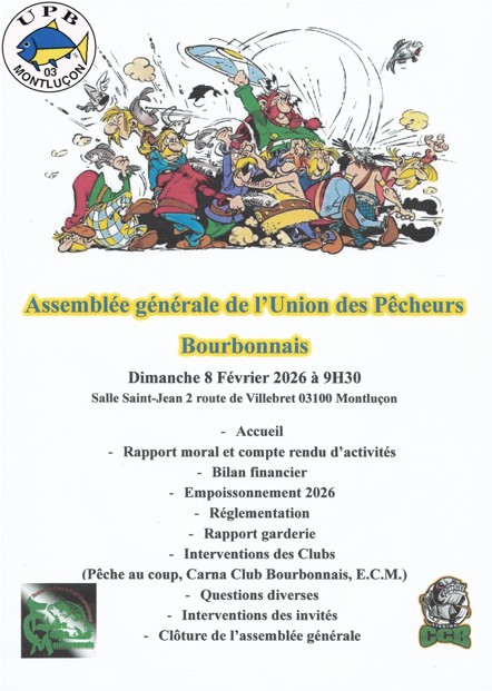 AAPPMA de MONTLUCON – Assemblée Générale le dimanche 08 février 2026 Date Fév 08 2026 Heure 9 h 30 min Lieu Salle Saint Jean 2 route de Villebret - MONTLUCON Catégorie Montlucon Organisateur AAPPMA MONTLUCON Partagez cet événement