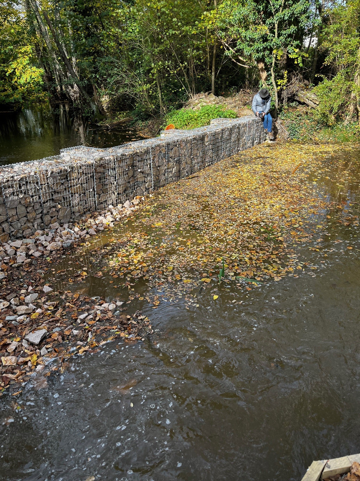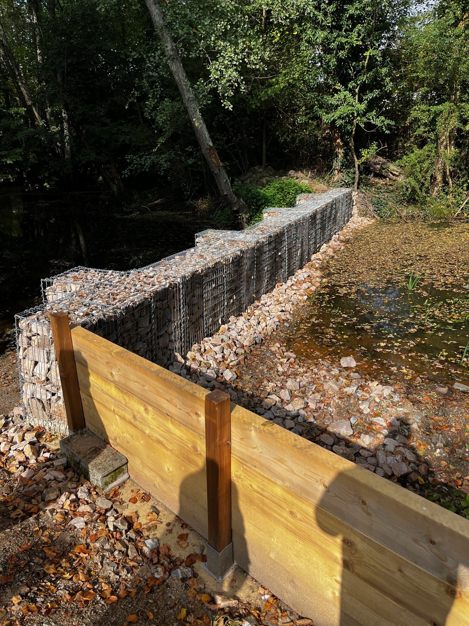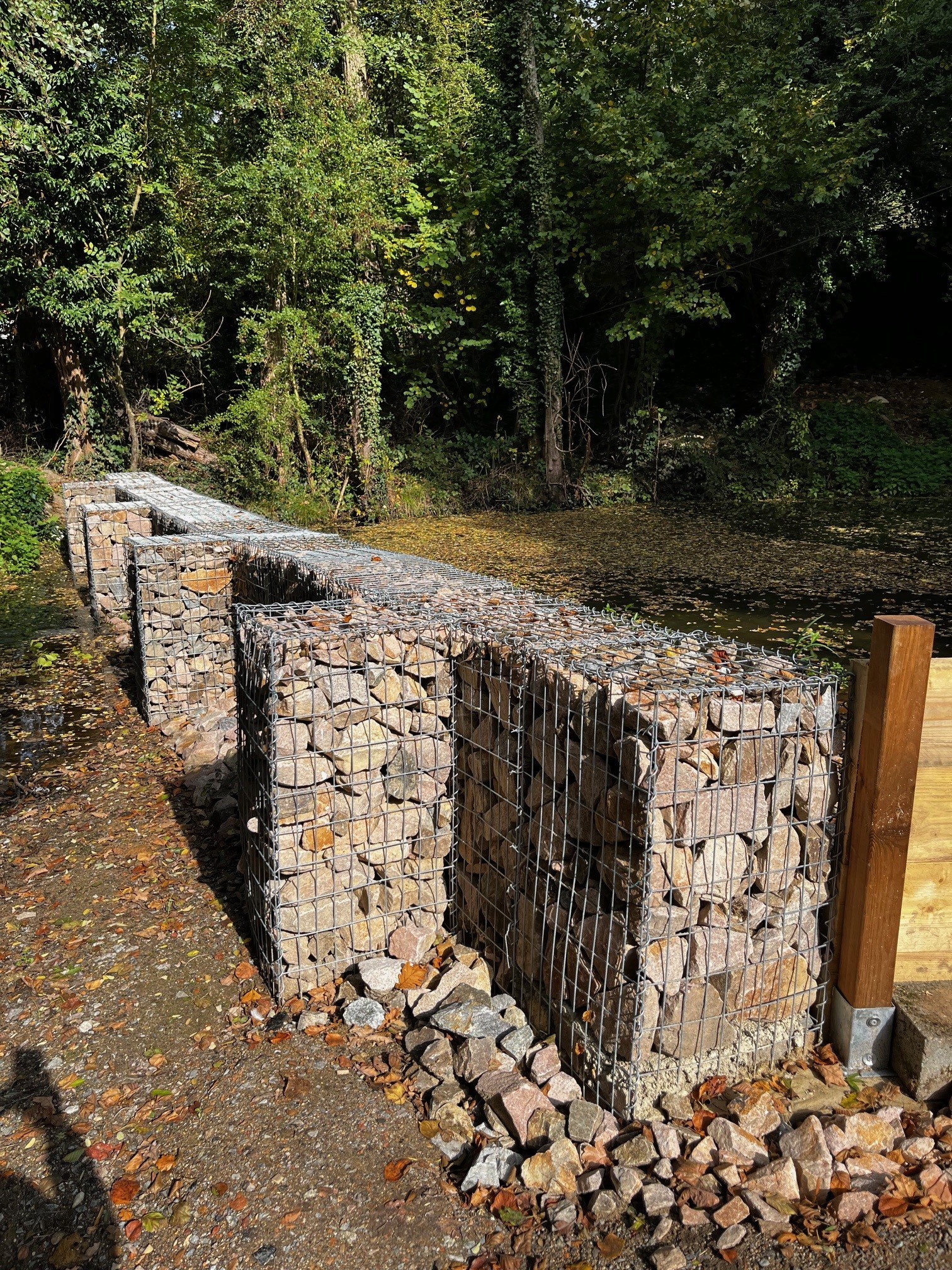 Ces travaux, réalisés à l’aval de la digue, ont consisté à créer un système pérenne de filtration des vases et sédiments évacués lors des vidanges. Ce dispositif innovant repose sur l’installation de gabions remplis de granulats de différents diamètres, permettant de retenir les particules avant qu’elles n’atteignent le milieu naturel.