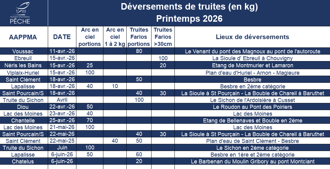 Durant tout le printemps 2026, les AAPPMA et la Fédération vont procéder à des déversements de truites sur différents cours d’eau et plans d’eau du département. Vous trouverez ci-dessous un tableau qui présente les dates et les lieux de ces déversements. Attention, ce programme est amené a évoluer tout au long de la saison et ce tableau sera actualisé très régulièrement à chaque modification du planning. En effet, ces déversements sont conditionnés par les niveaux d’eau ou par la météo.