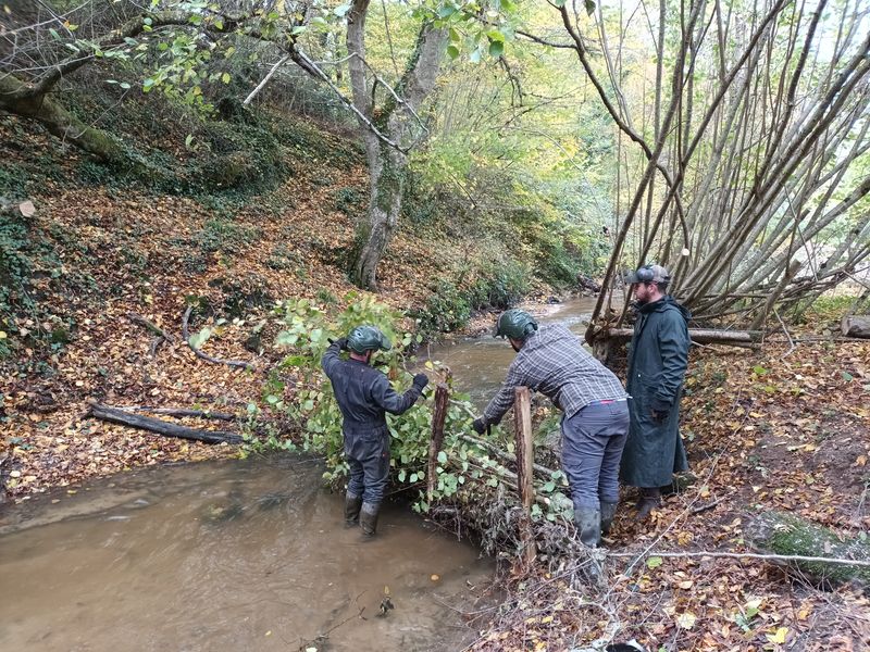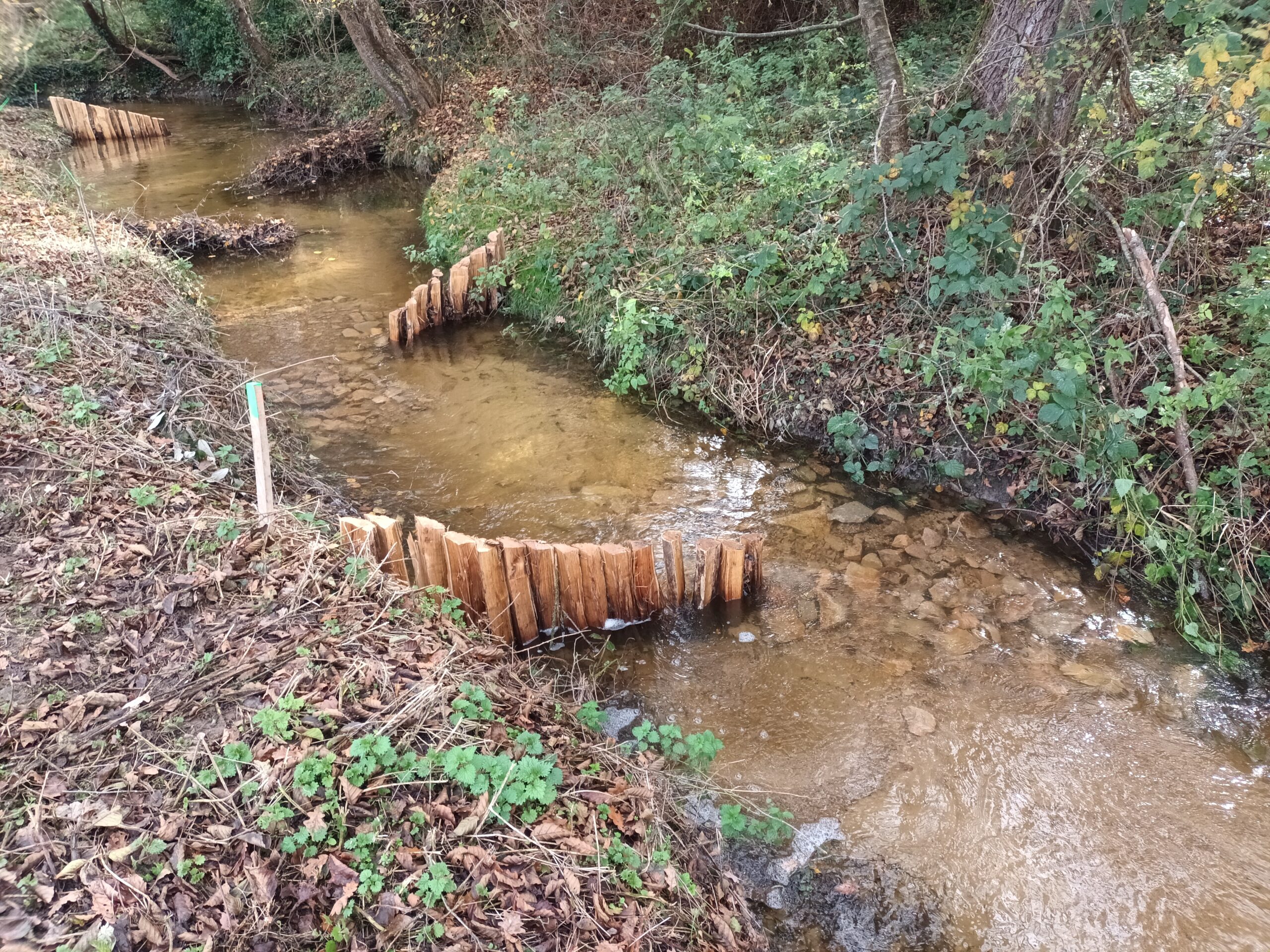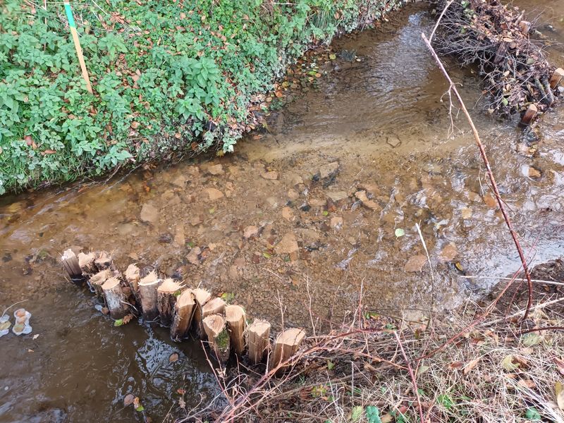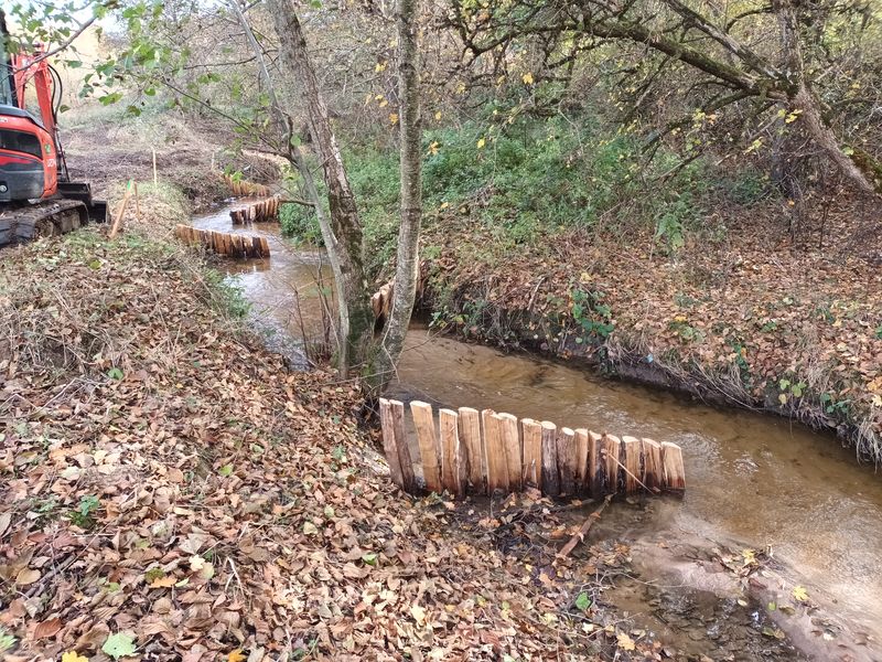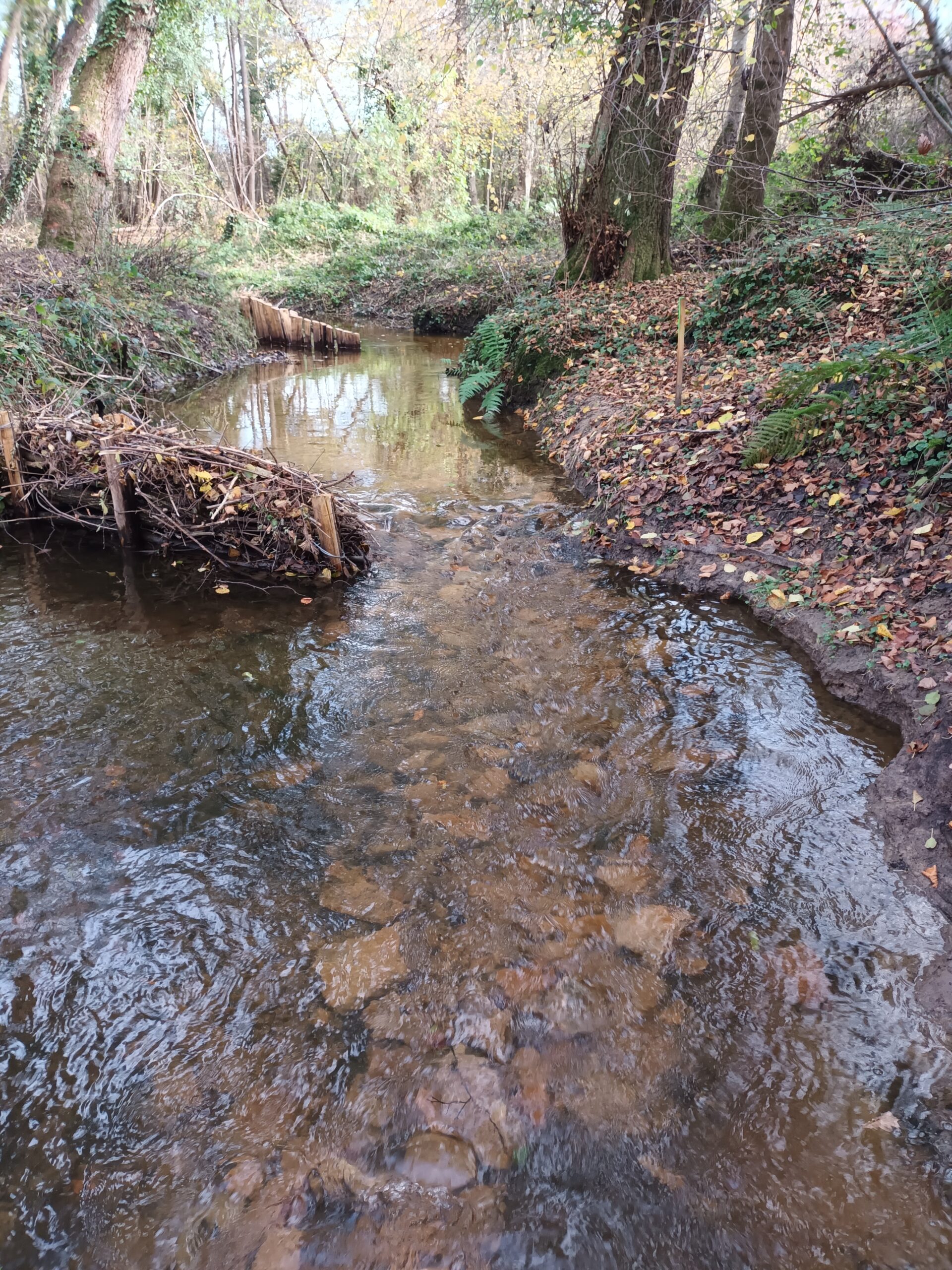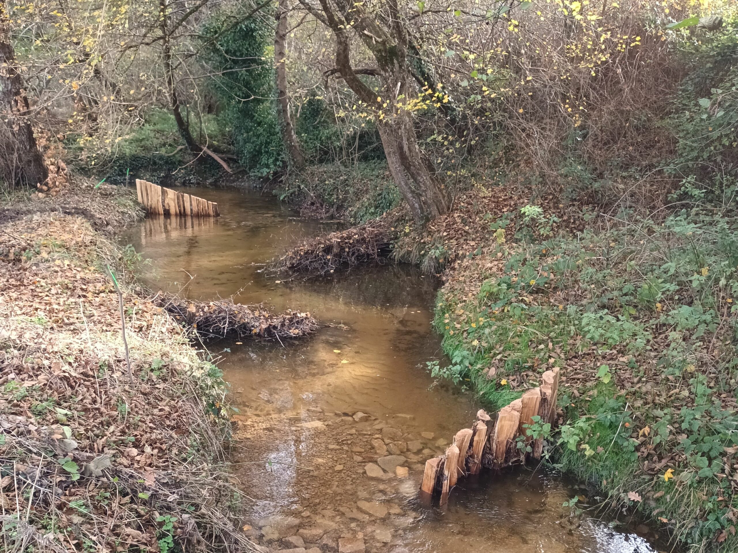 Les travaux se sont ensuite poursuivis par l’implantation dans le lit du ruisseau de 102 épis déflecteurs de différents types (en fascines de branches mortes et en pieux jointifs) ainsi que 16 souches d’arbres et 5 peignes.