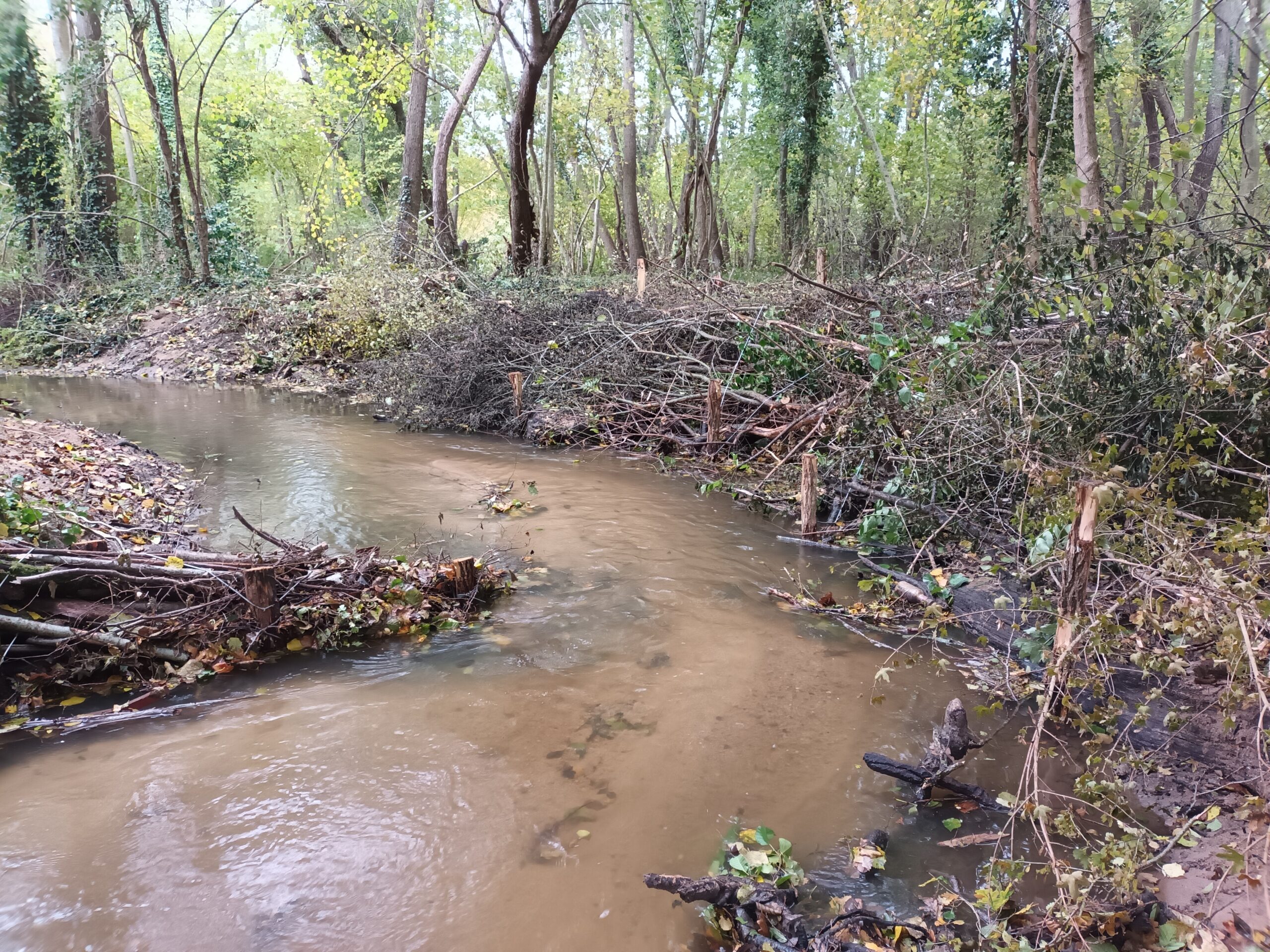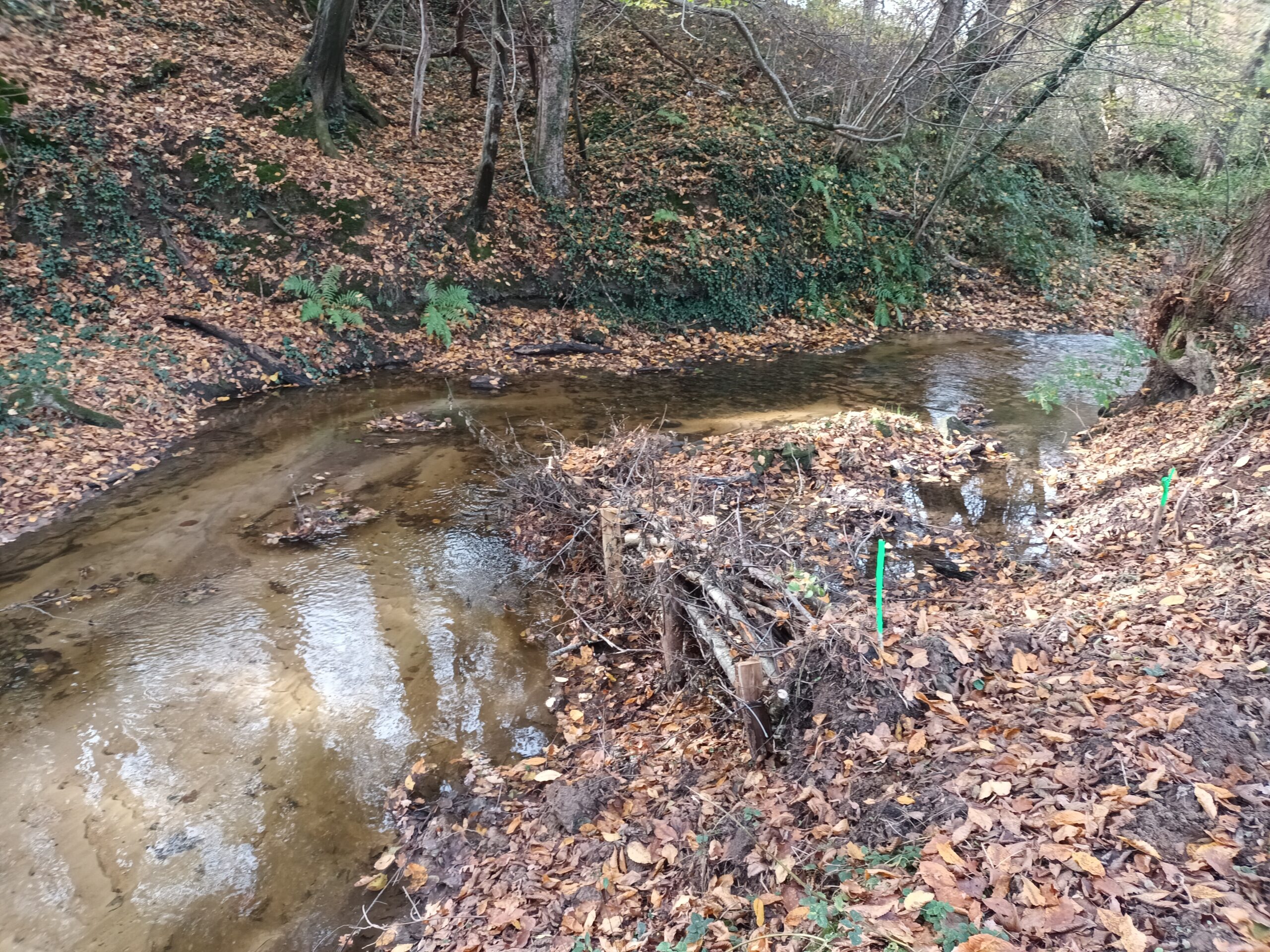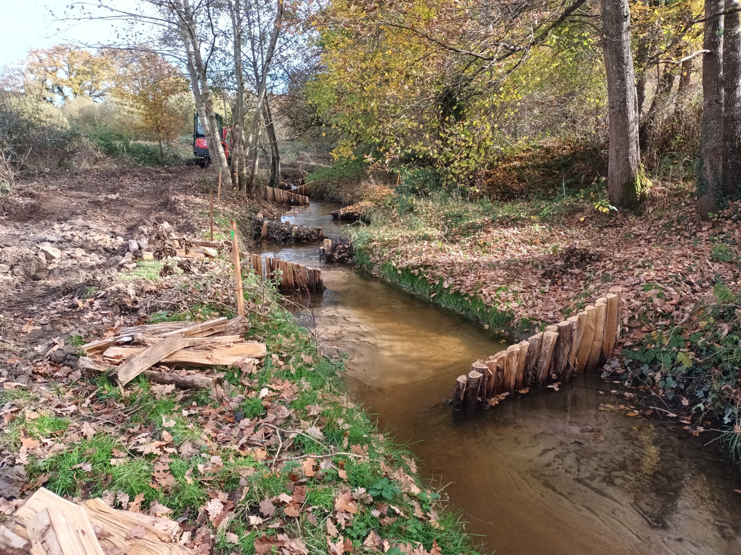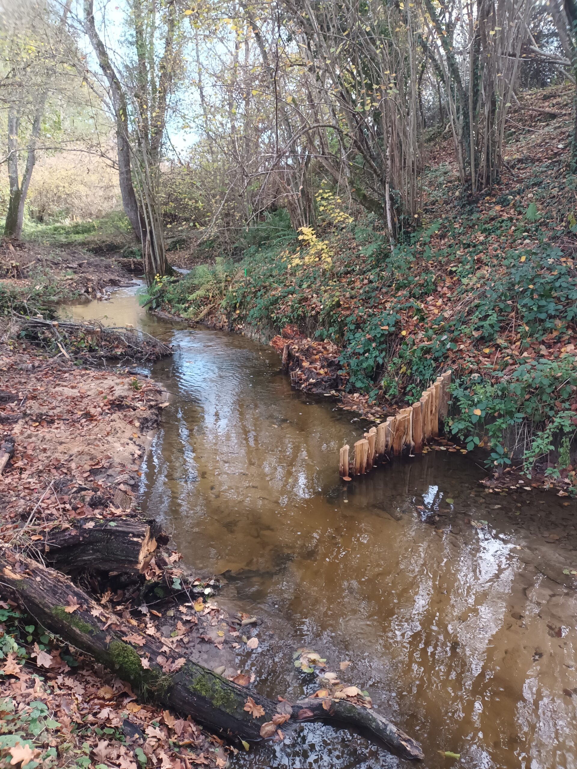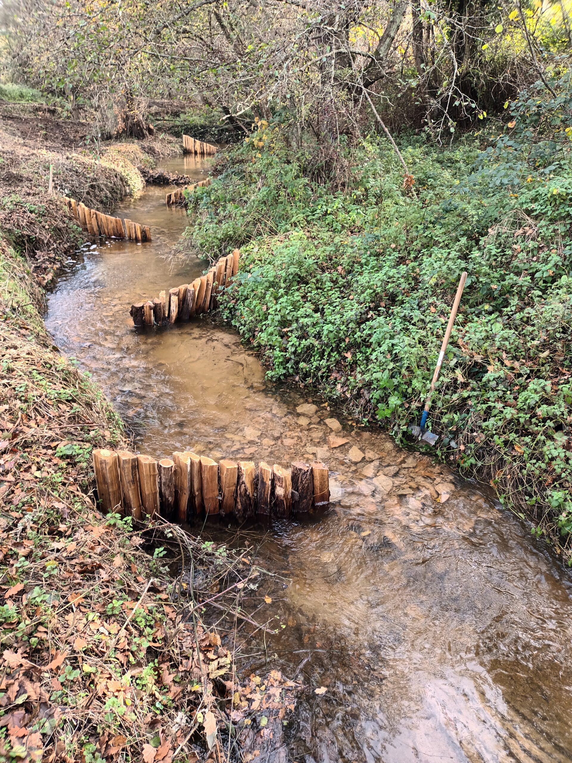 Les travaux se sont ensuite poursuivis par l’implantation dans le lit du ruisseau de 102 épis déflecteurs de différents types (en fascines de branches mortes et en pieux jointifs) ainsi que 16 souches d’arbres et 5 peignes.