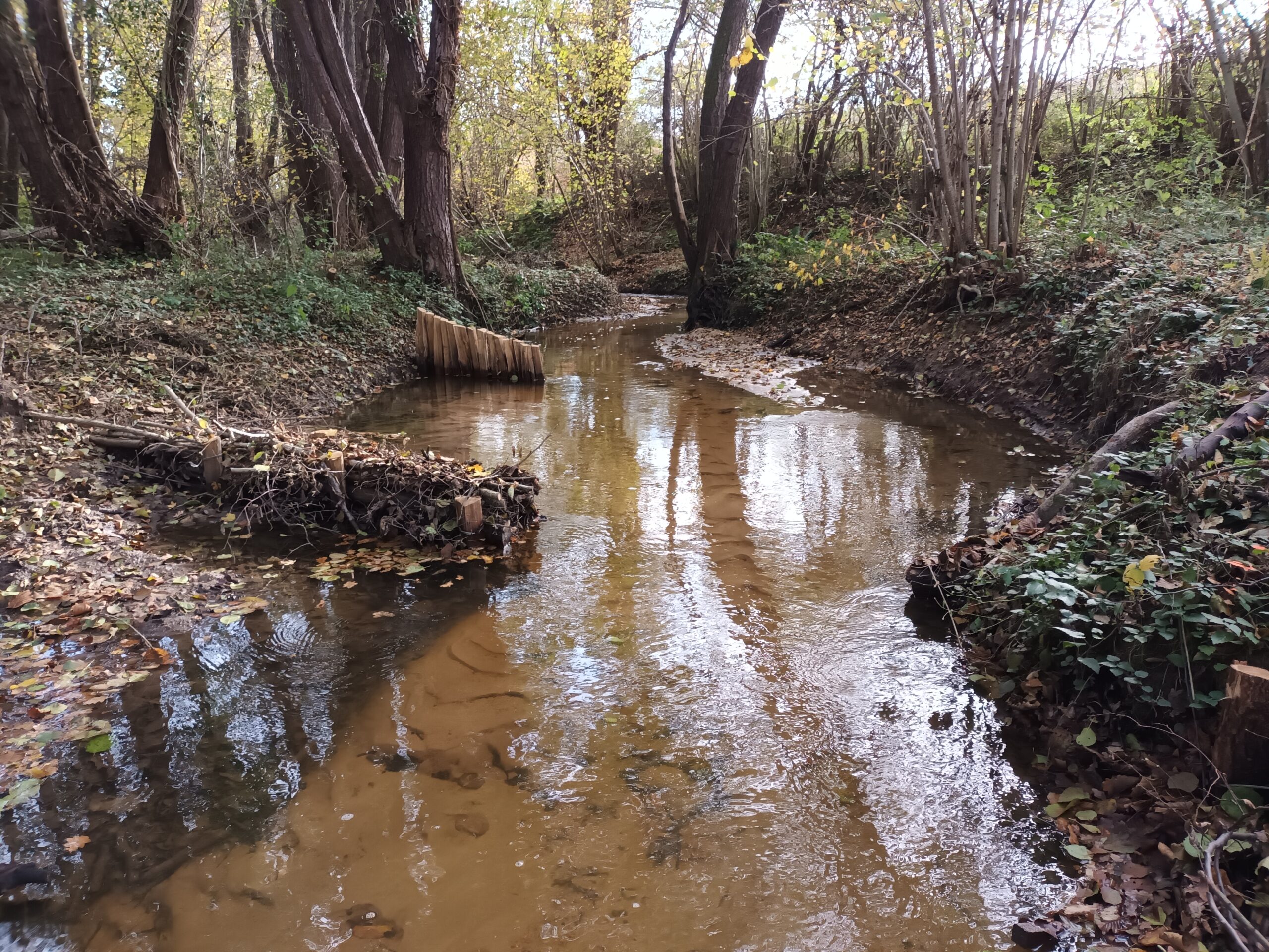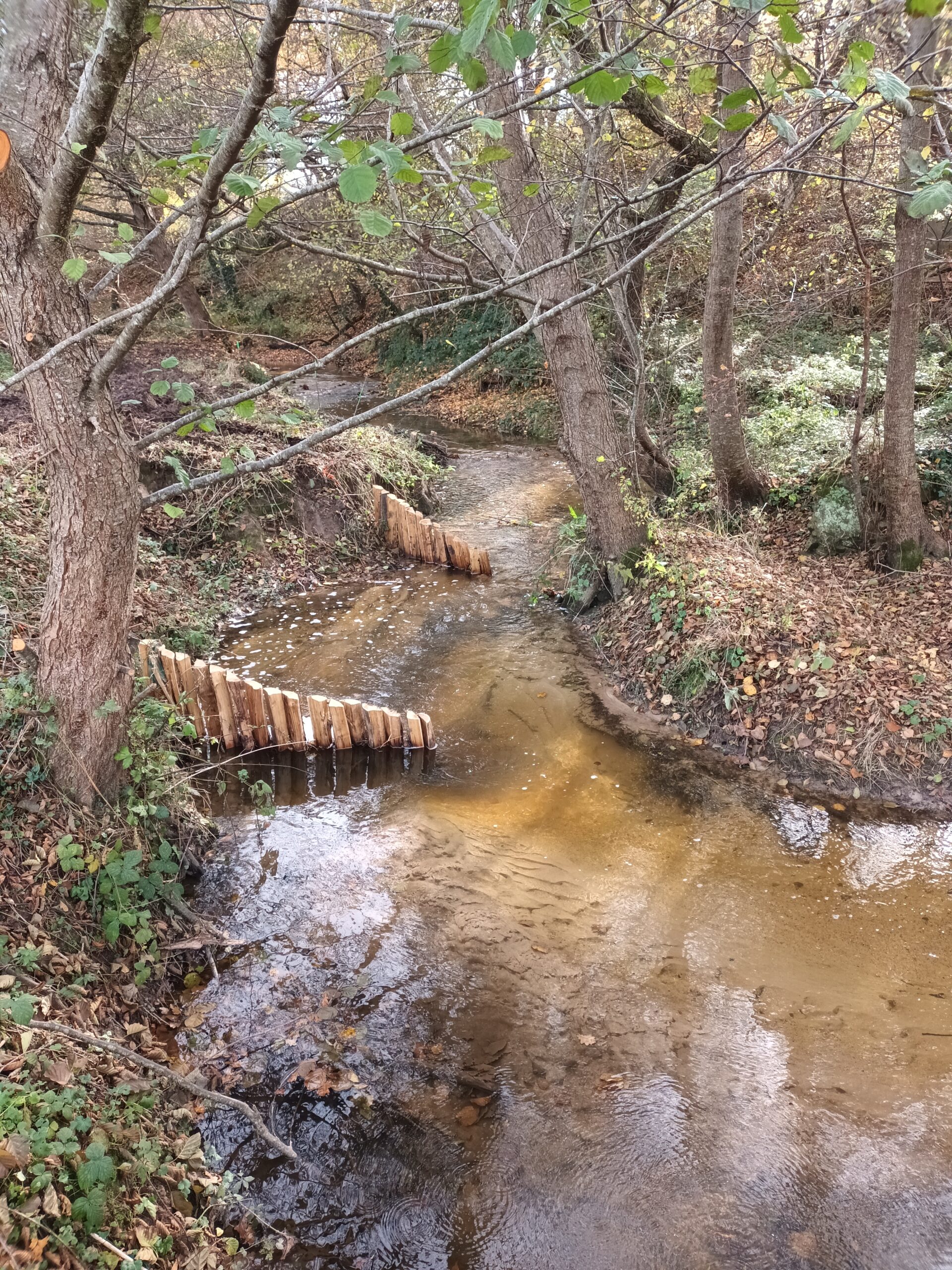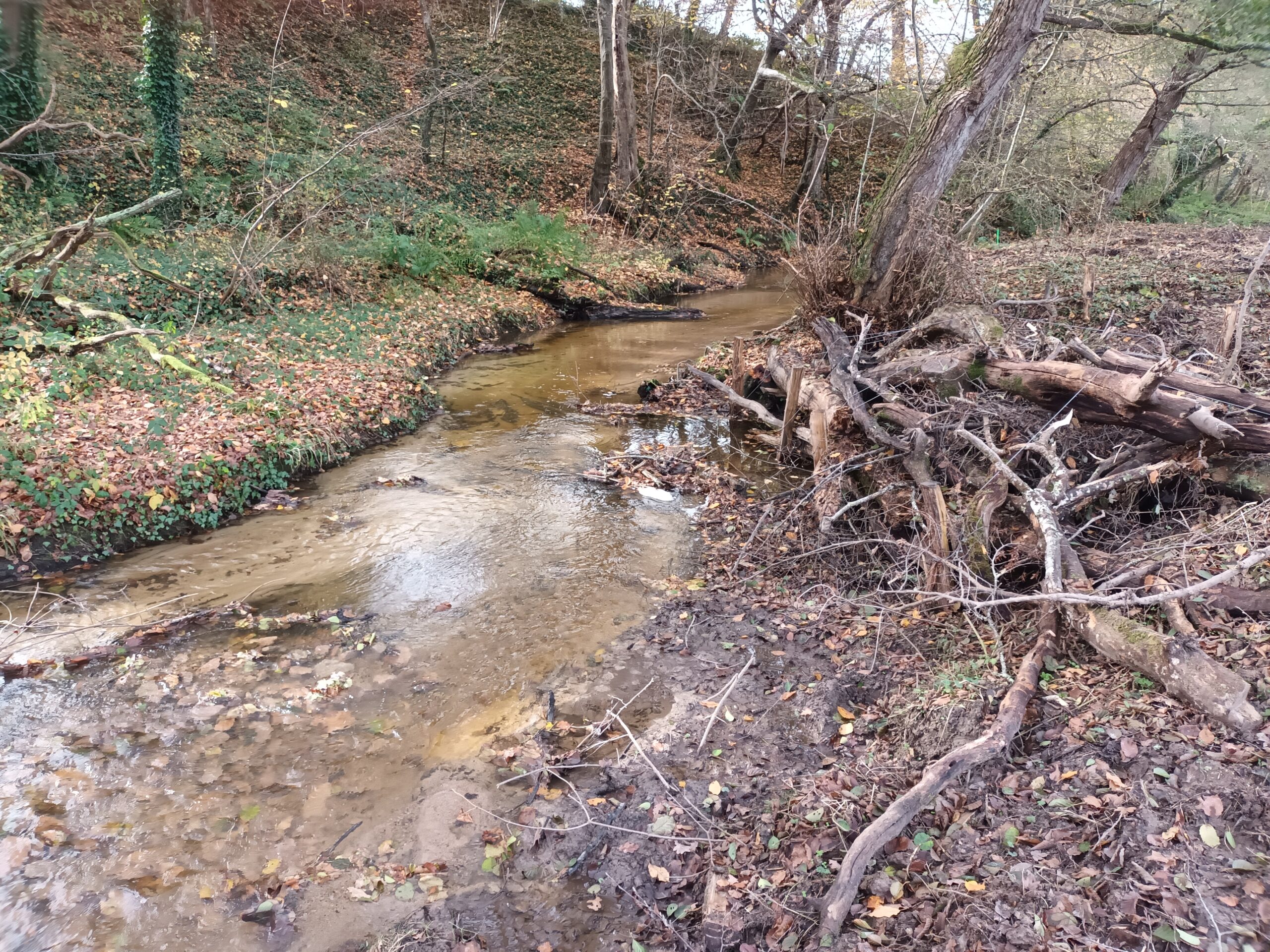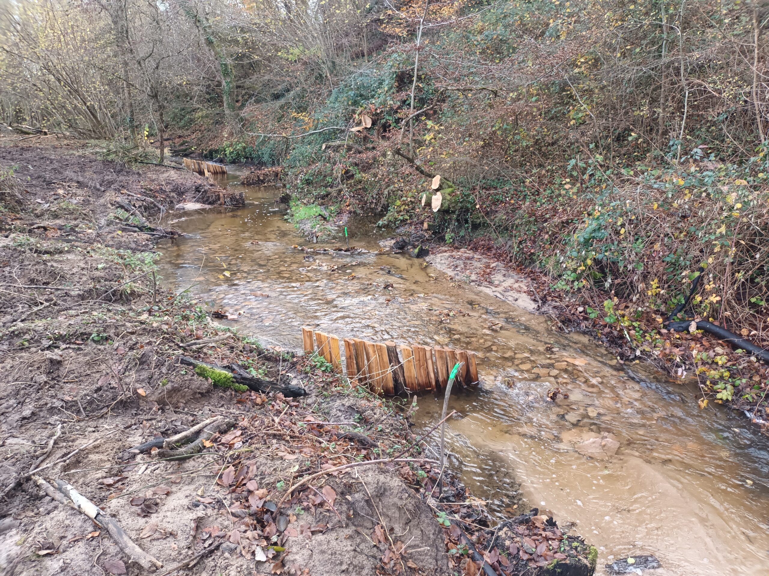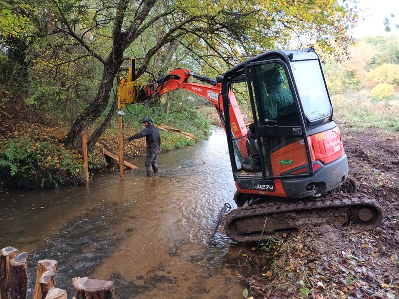 Les travaux se sont ensuite poursuivis par l’implantation dans le lit du ruisseau de 102 épis déflecteurs de différents types (en fascines de branches mortes et en pieux jointifs) ainsi que 16 souches d’arbres et 5 peignes.