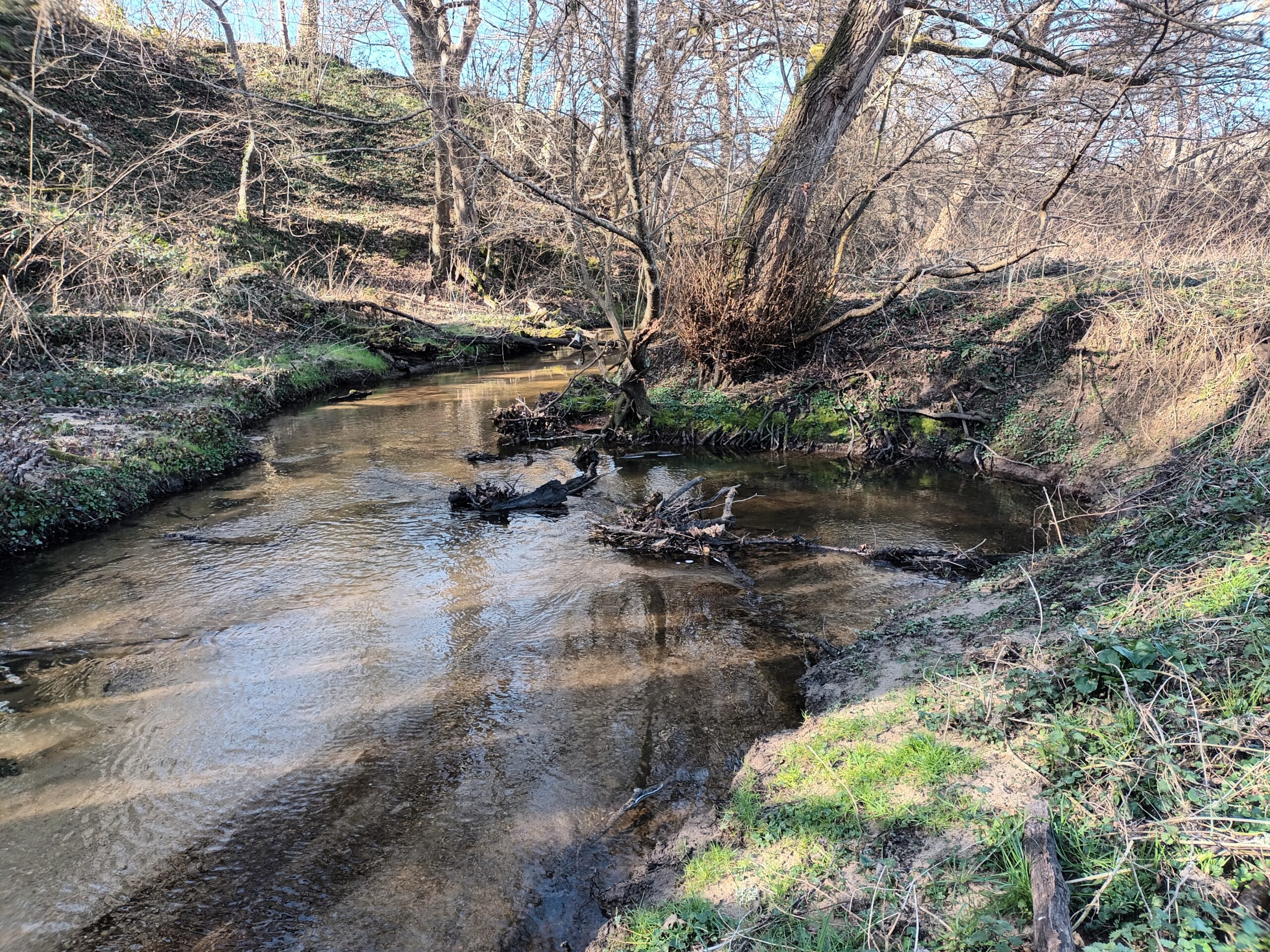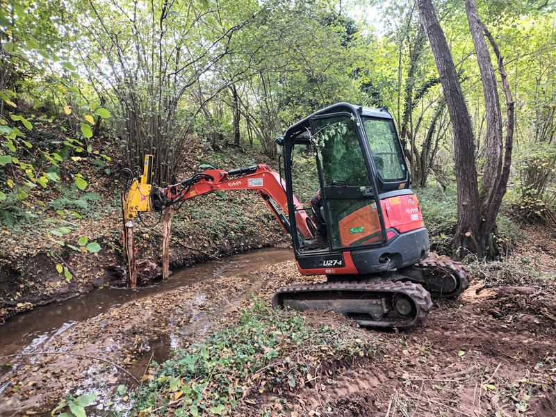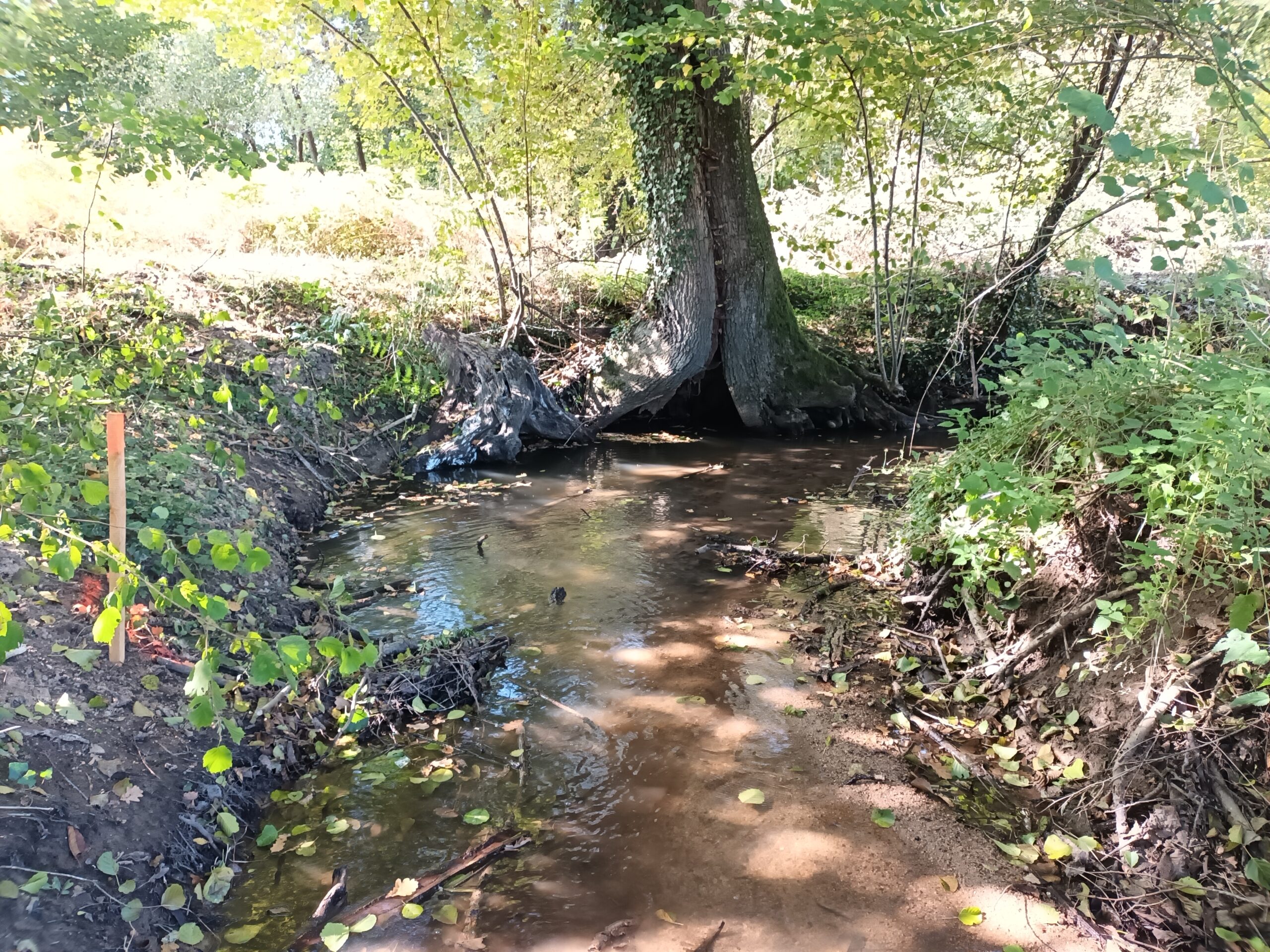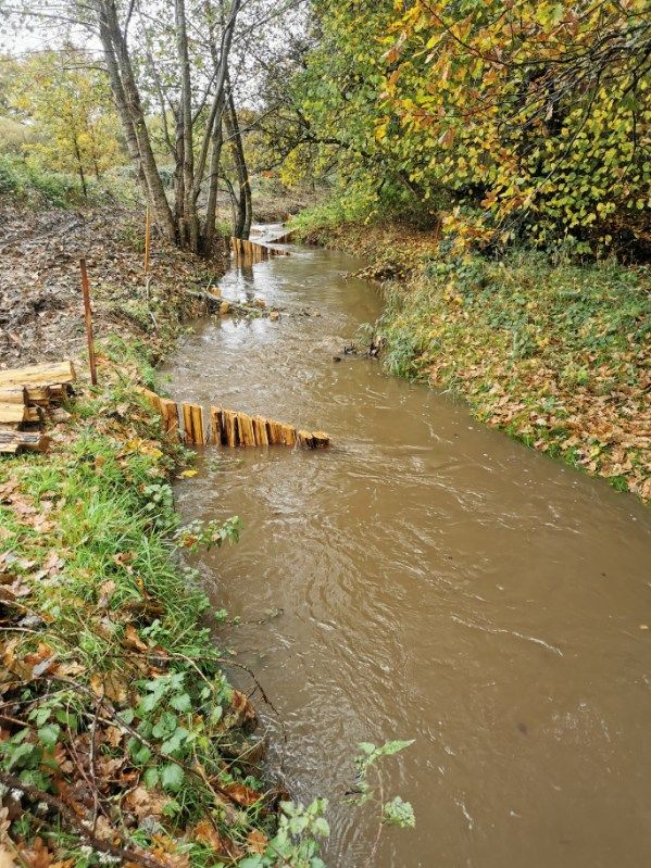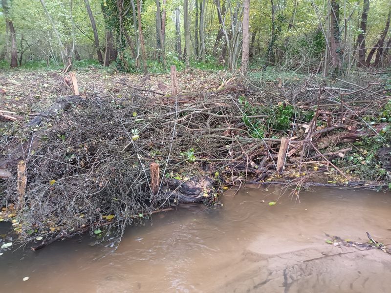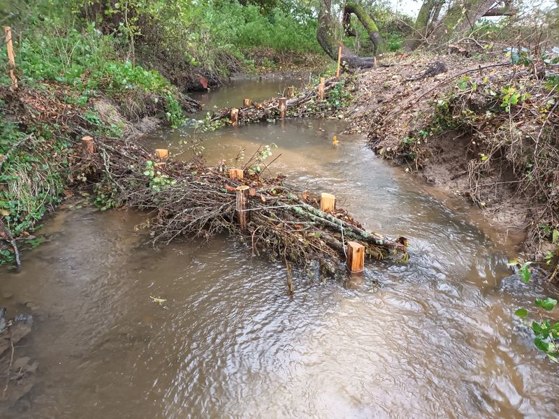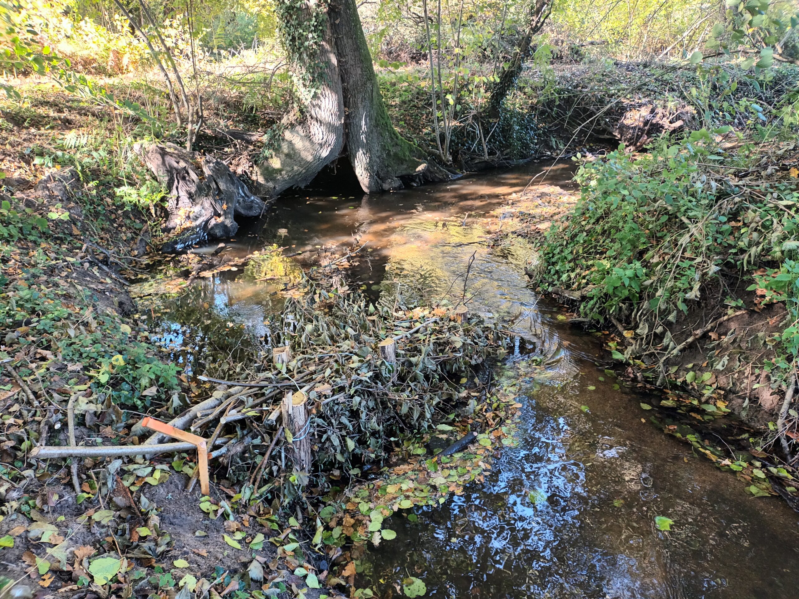Les travaux se sont ensuite poursuivis par l’implantation dans le lit du ruisseau de 102 épis déflecteurs de différents types (en fascines de branches mortes et en pieux jointifs) ainsi que 16 souches d’arbres et 5 peignes.